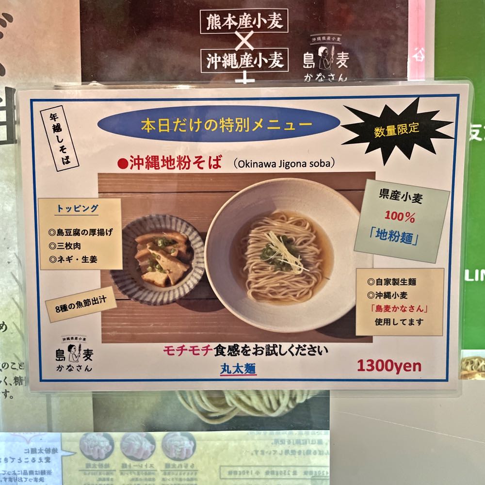 特別メニューの沖縄産の小麦(地粉)100%の沖縄そばを注文しました。