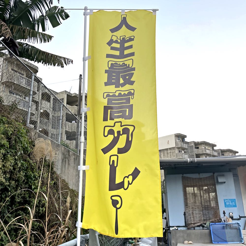おおお、人生最高カレーの幟旗が。